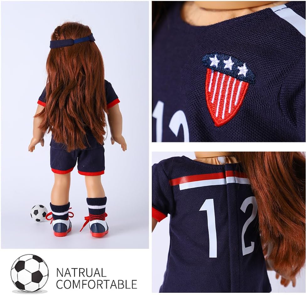 【VERSATILE FIT:】 Our Navy Blue Soccer Uniform is designed to fit most 18-inch dolls, compatible, this uniform is a perfect fit and enhances their overall outfit choices.