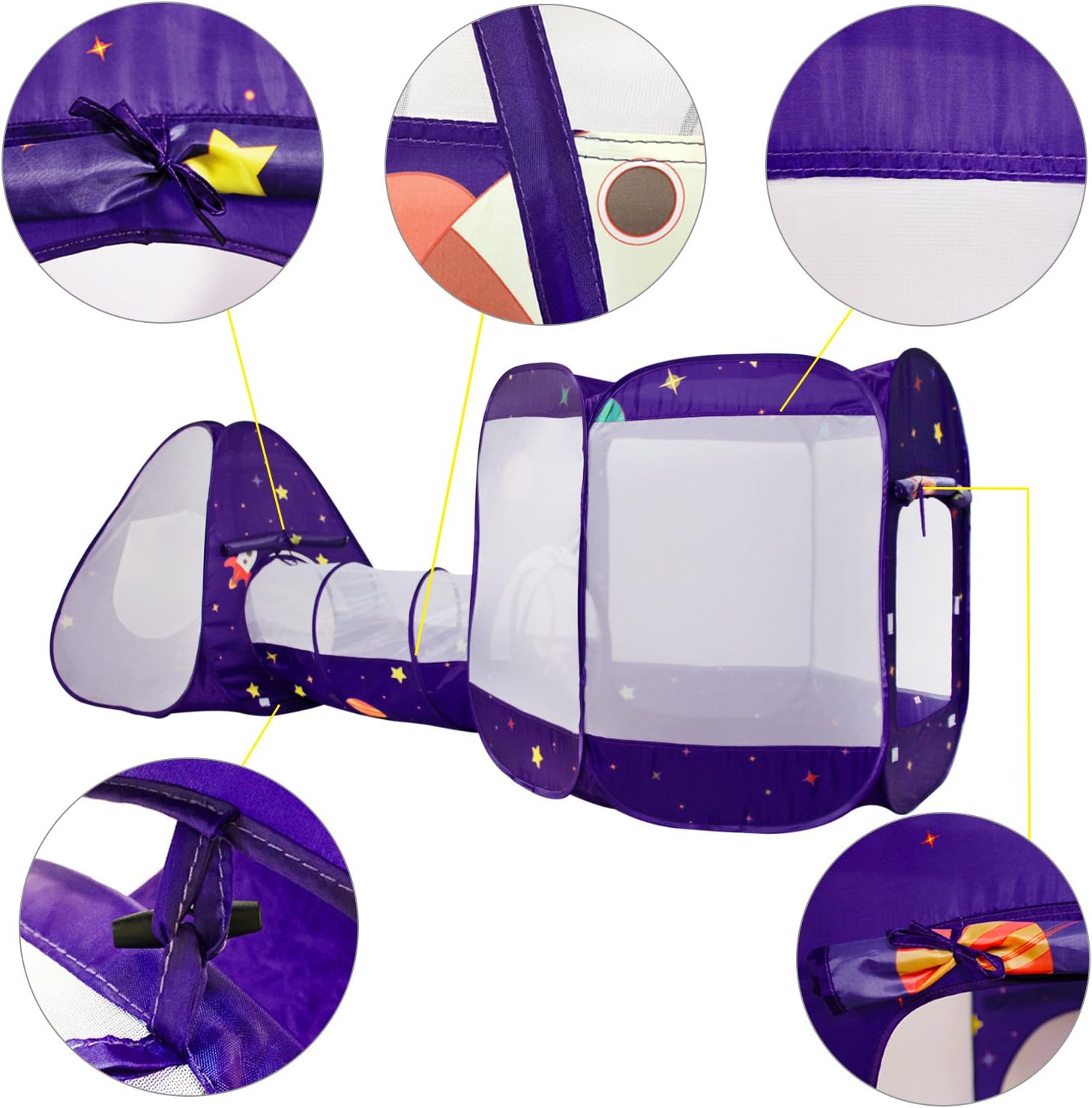 This Space Pattern Design on tent, tunnel and ball pit encourage children’s imagination, color perception and shape recognition.