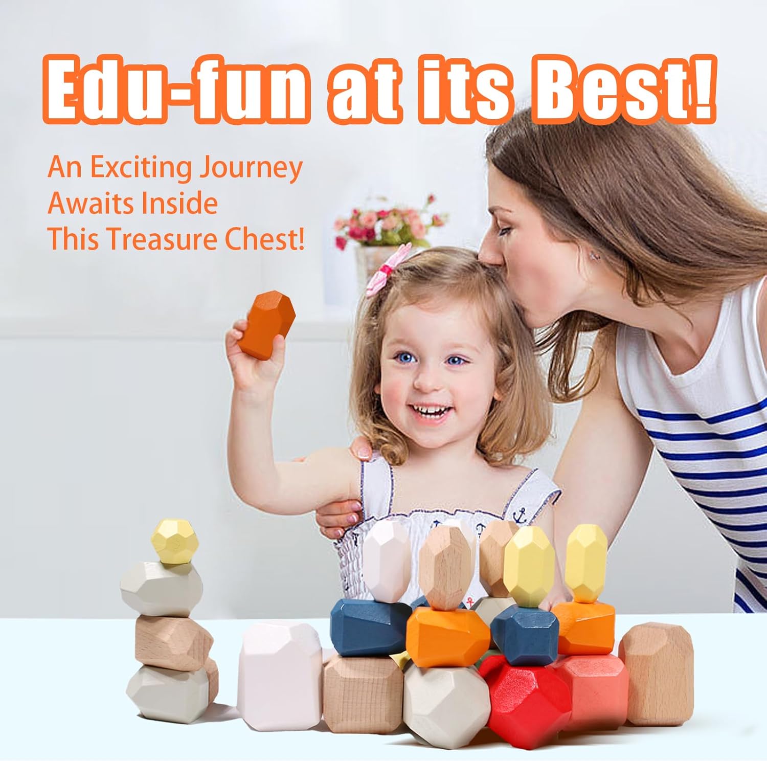 36 PCS Wooden Stacking Stones Toys-The set of stacking rocks building blocks for kids comes with 36 pieces in different sizes, shapes and colors, making the building game more attractive and challenging. The stacking blocks are perfect sensory toys for toddlers 3-5