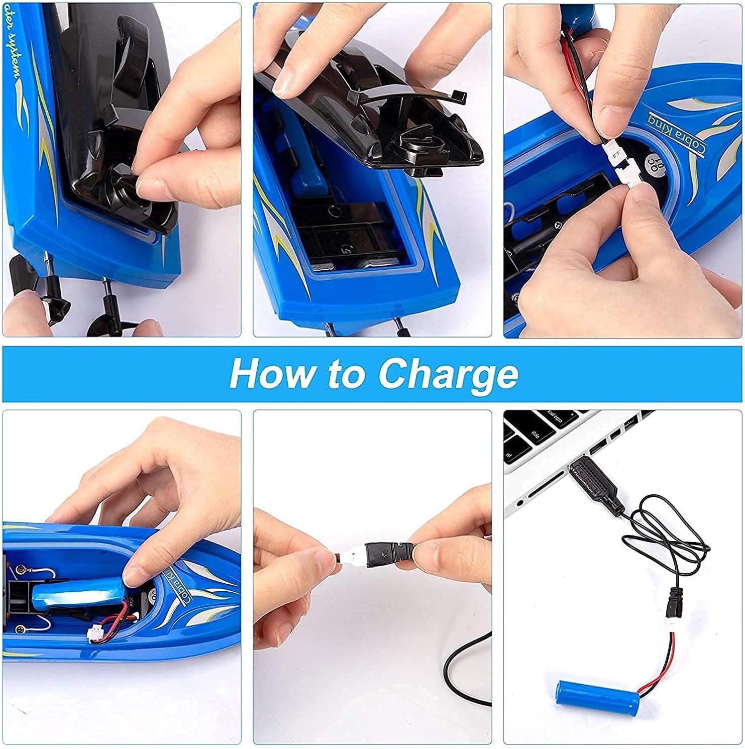 The RC Boat uses 3.7V 650mAh rechargeable battery with USB cable,2*1.5V AA batteries(Not included)for rc controller,15 – 20 mins playing time, 1.5 hours Charging time