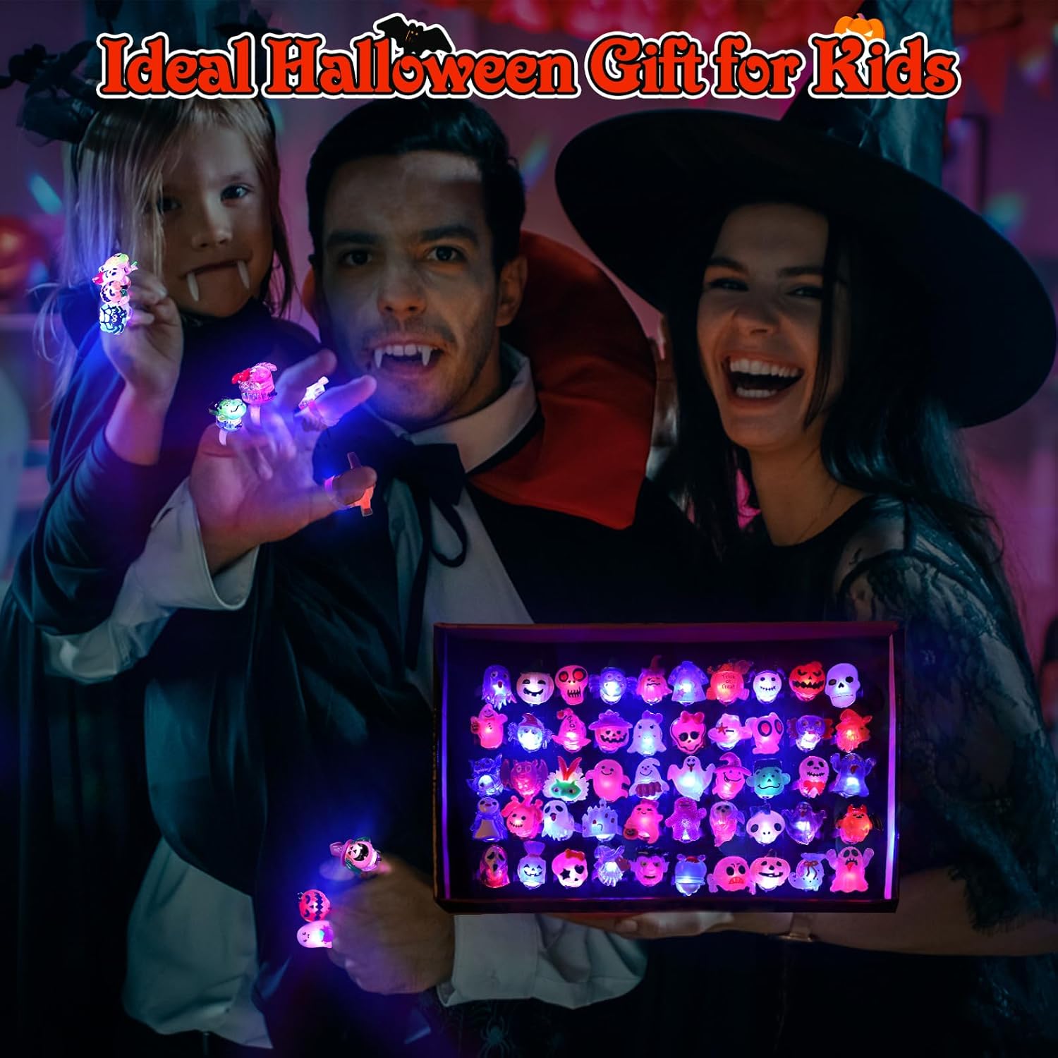 NOVELTY HALLOWEEN GIFT: 50 pcs special Halloween LED finger rings, come with a color box with Sponge pad, neatly placed inside. Made of non-toxic, harmless soft plastic and resin materials, won’t hurt skin, kids play safely. Perfect for Halloween gifts, birthday gifts and other holiday gifts. Take assorted flashing rings set home, your kids will get a huge surprise!