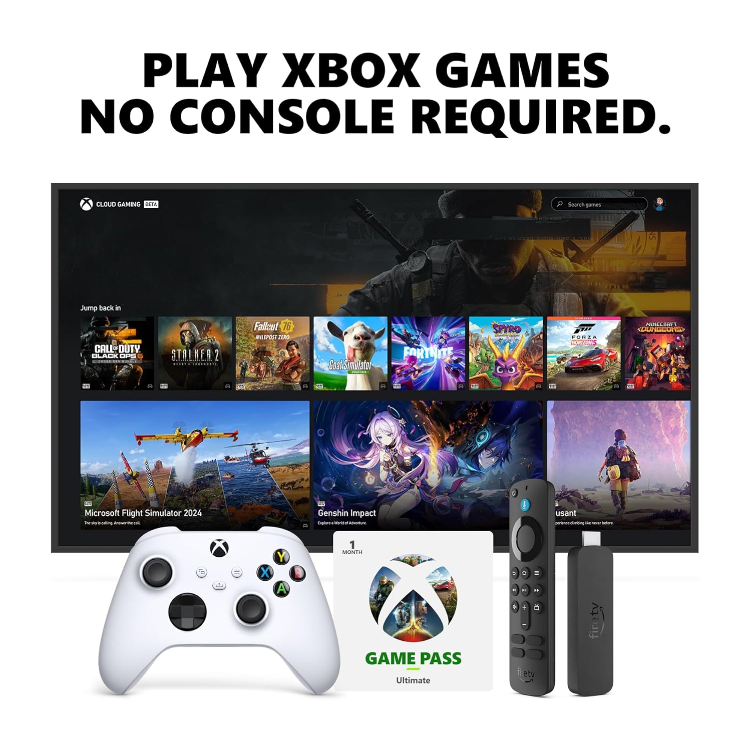PLAY XBOX GAMES. NO CONSOLE REQUIRED: The only streaming media player with the Xbox app: Stream hundreds of other high-quality games directly on your Fire TV with Xbox Game Pass Ultimate via cloud gaming.