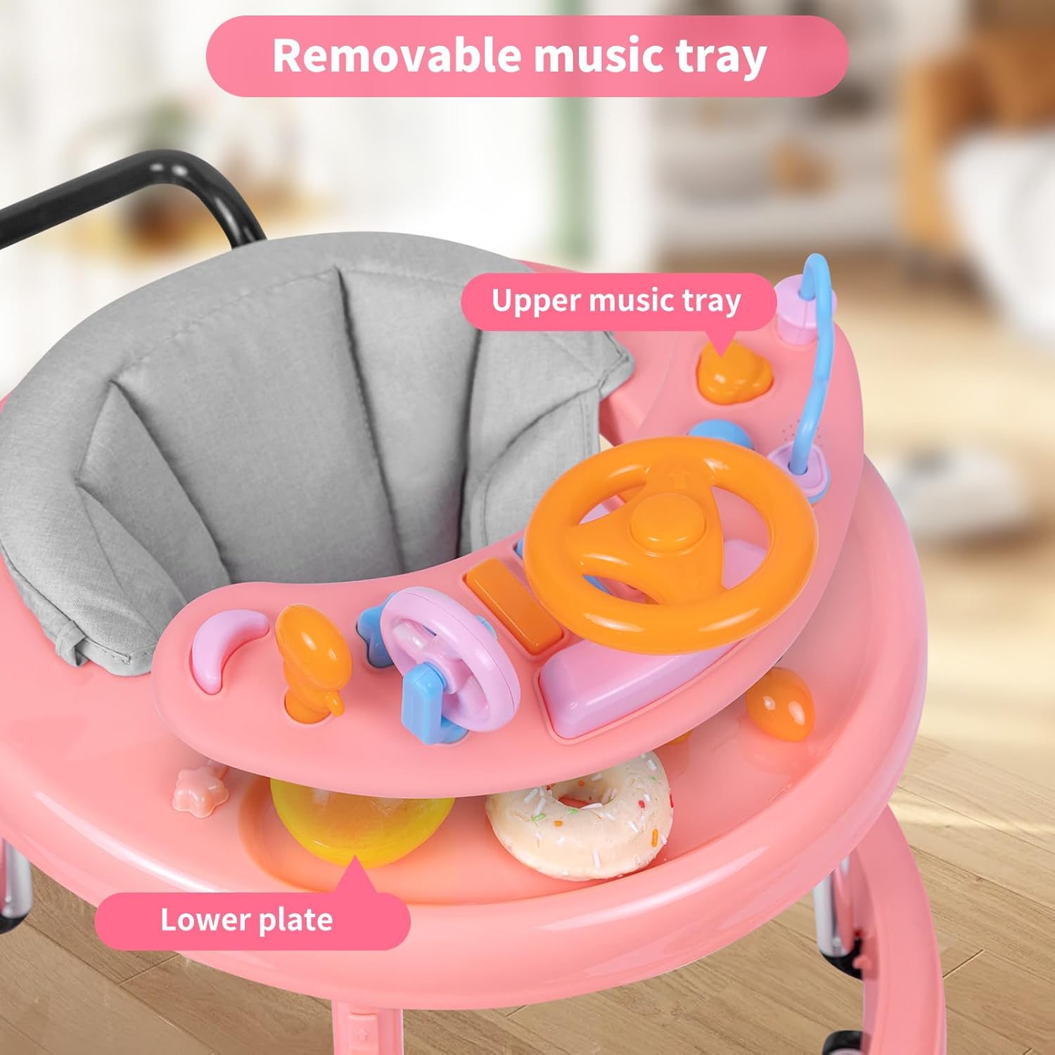 Baby walker with music and toys, Including a steering wheel, piano keys, lights, and a spinning ball, This center provides fun playtime for your childrenThe enlarged round base and four sturdy stainless steel brackets provide double protection for your babyThe enlarged round base and four sturdy stainless steel brackets provide double protection for your babyUpgraded height adjustment method, you can easily adjust the height by lifting the button