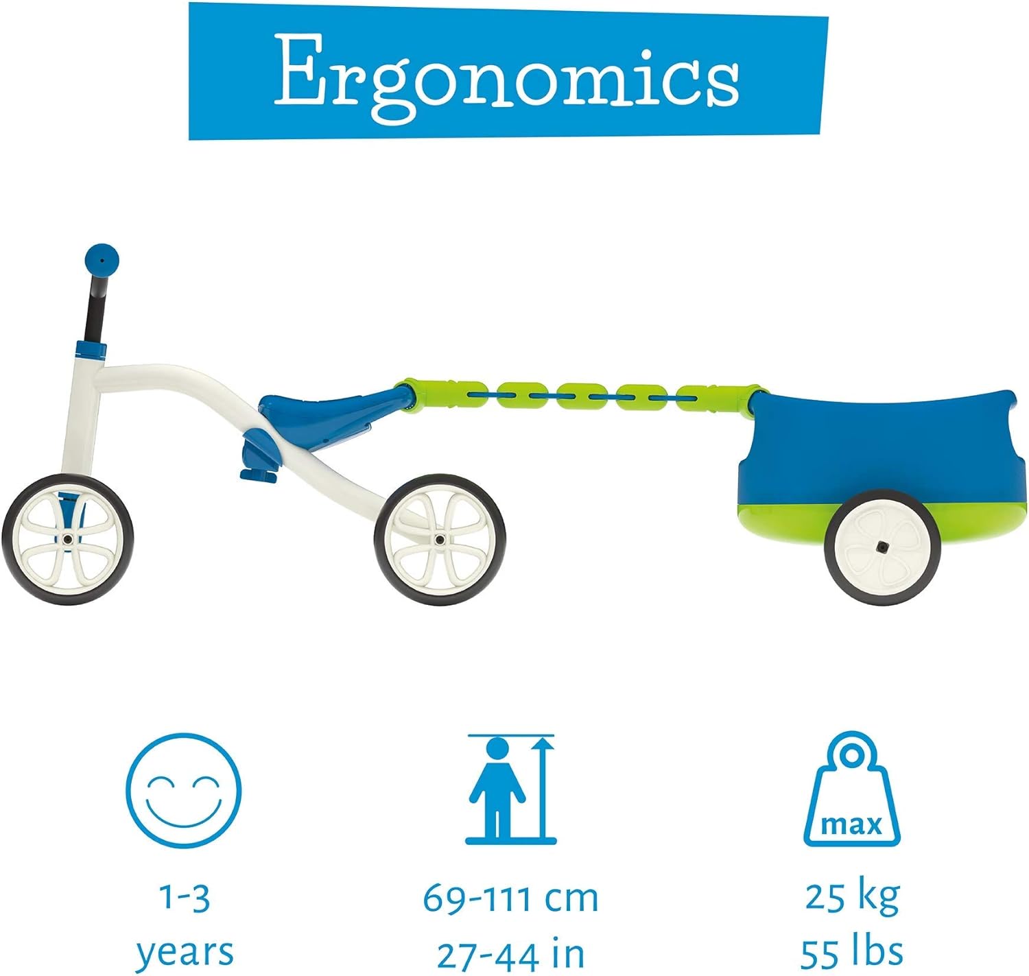 Both the QUADIE and TRAILIE feature convenient hand grips, allowing you to easily push, pull or carry them; Recommended for children ages 1-3, with a maximum weight of 55 lbs.