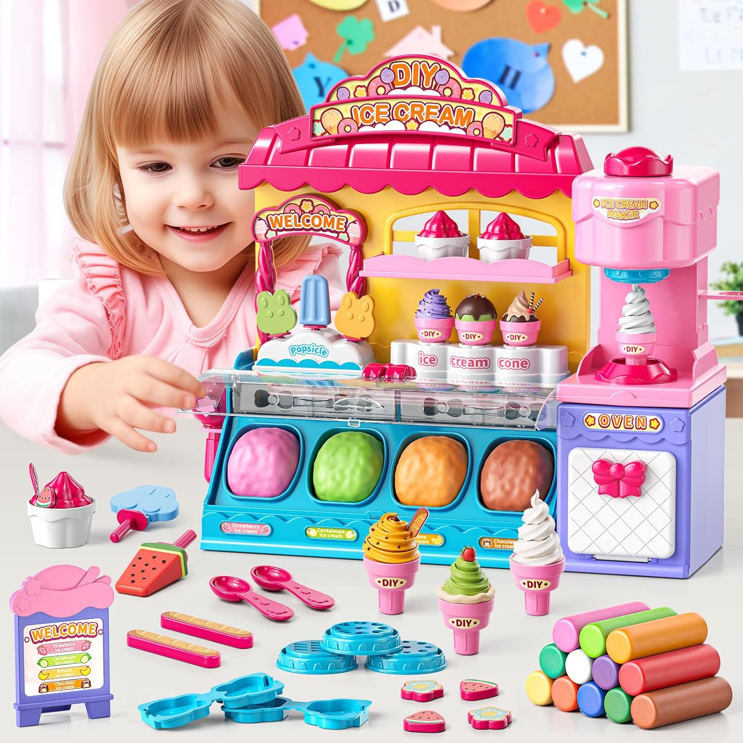 Ice Cream Shop Toy: The ice cream store toy for pretend play toys 5-7 comes with a counter, an machine, a large scooper, 2 fixed moulds, 3 spoons, 3 cones cups, 3 dessert bowls, 1 signboard, and various accessories to decorate toy food for kids ages 4-8