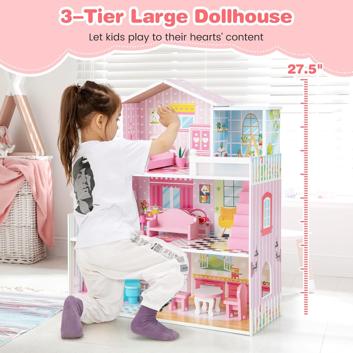 Costzon Wooden Dollhouse for Kids, 3-Story Semi-Open Doll House with 5 Rooms & 10 Pieces Furniture Set, Ladders & Balcony, Preschool DIY Pretend Play Dollhouse Toy, Gift for Girls & Boys Ages 3+