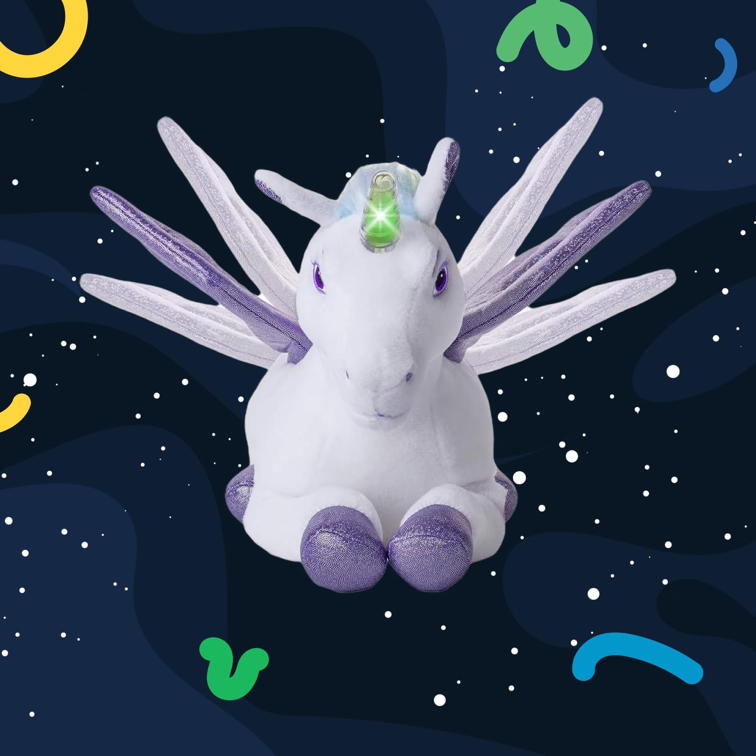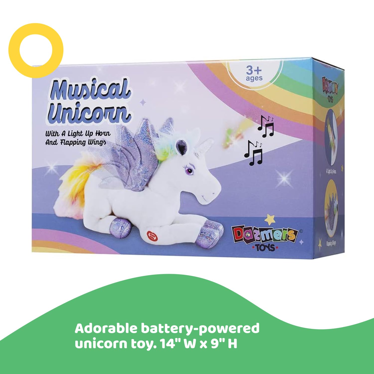 Magical Lights and Sounds: when turned on, the glitter purple wings swing back and forth, the horn lights up rainbow colors and displays a magical melody that goes along with the unicorn motion.