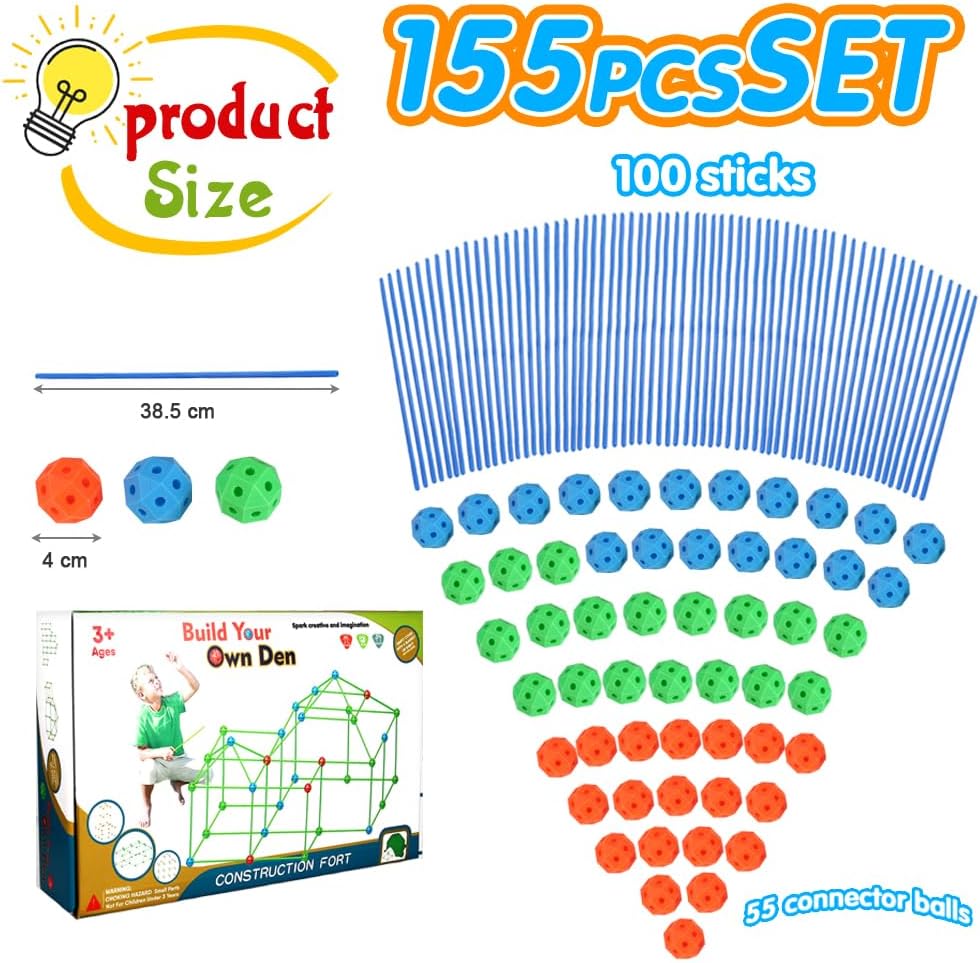 Complete Fort Building Kit: The fort building kit includes 50 durable connector balls and 100 long rods,all meticulously crafted from high-quality, non-toxic, lead-safe materials. The rods are made from tough polypropylene (PP), known for its strength and resilience, while the connector balls are composed of a specially formulated blend of PP and polyethylene (PE).This unique combination ensures exceptional durability and flexibility, making the set safe and reliable for children’s play