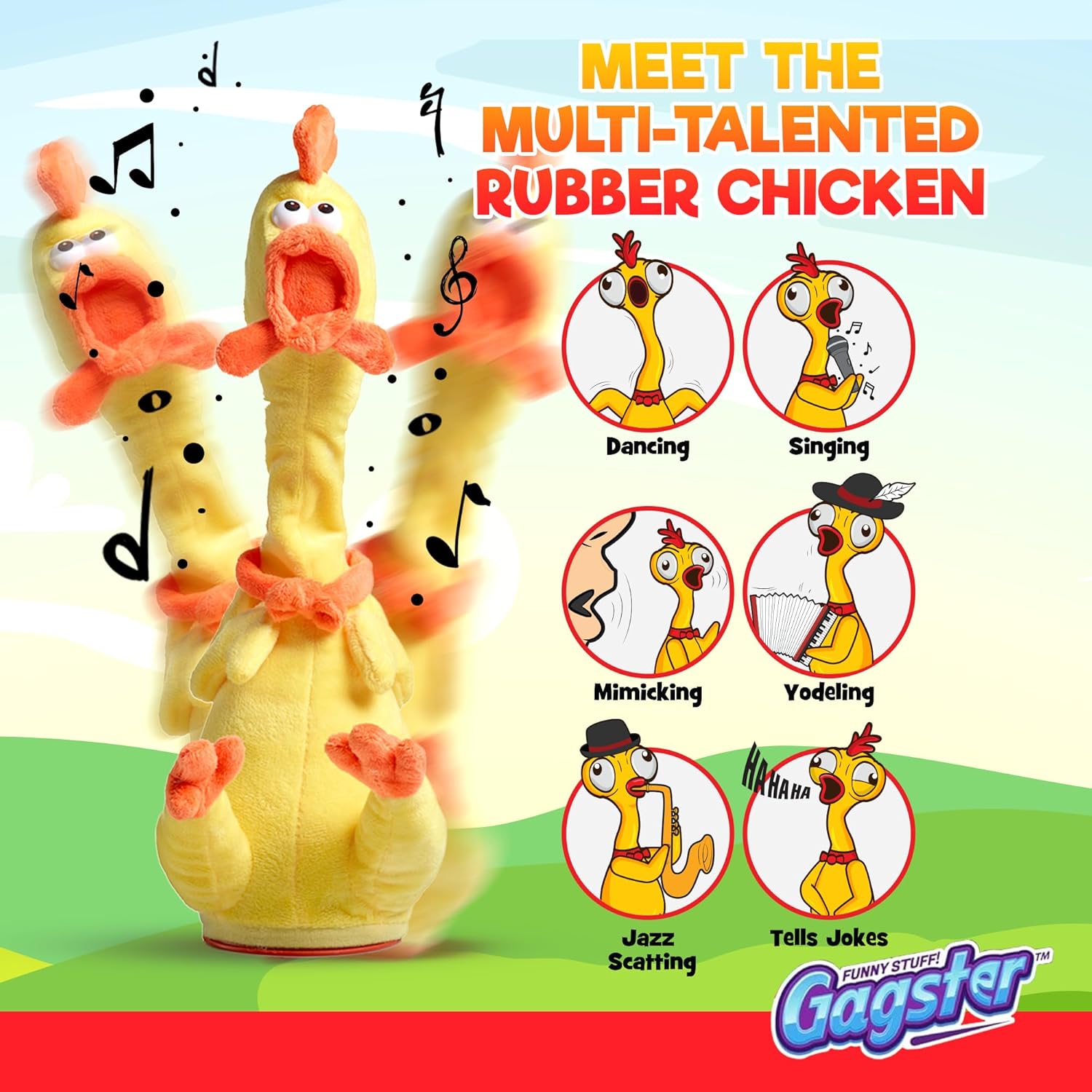MIMICS YOUR EVERY WORD: Just like its yodeling pickle and screaming goat cousins, the Gagster Dancing Rubber Chicken Repeating Toy is a master of mimicry with a squeaky twist. Simply speak, sing, or tell jokes, and this feathered friend will repeat your words with a side-splitting, squeaky twist. Its comical voice and impeccable timing add an extra layer of amusement to your conversations, making it the life of any party.