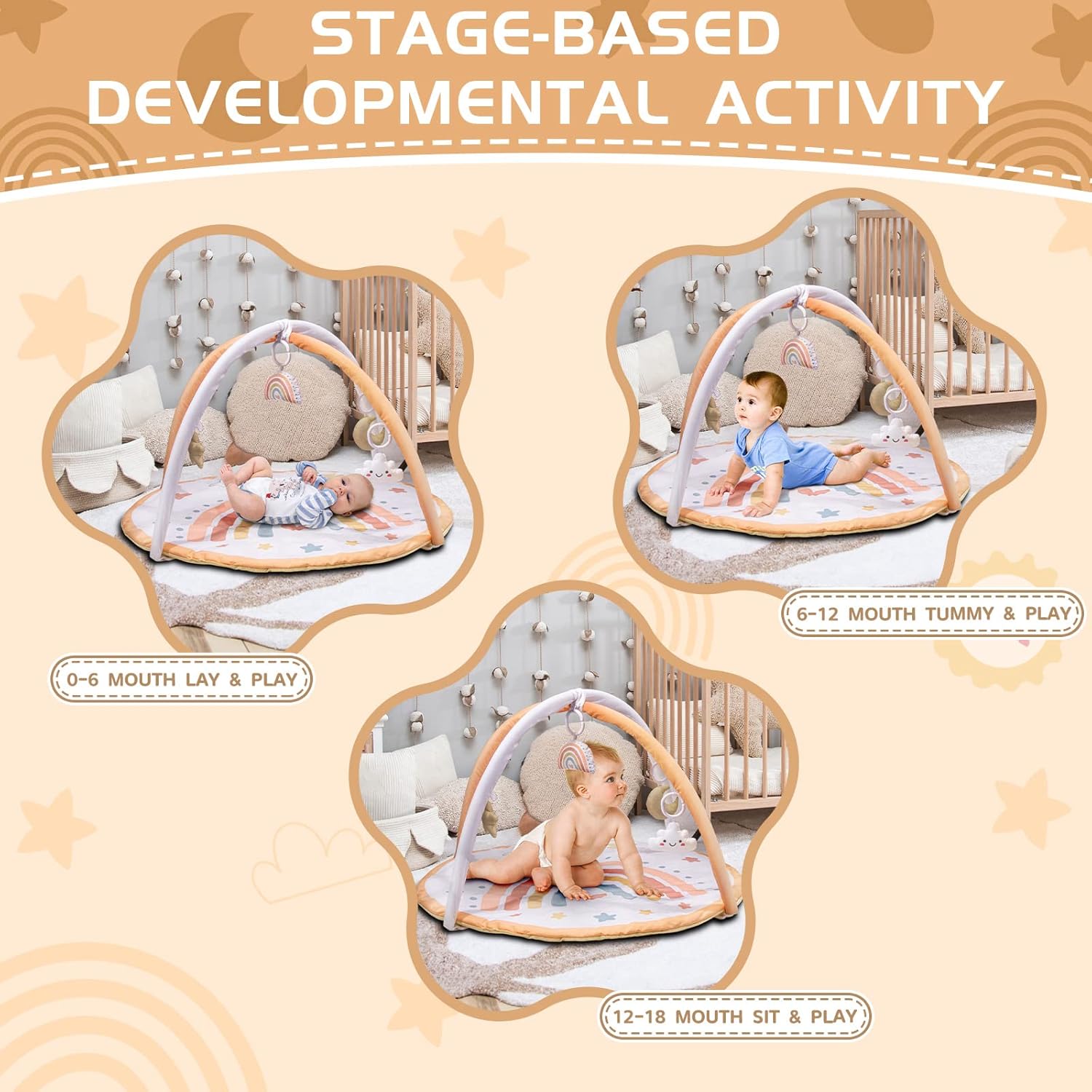 💛【Removable Sensory Toys】Provides 5 detachable sensory toys including sun, cloud, star, rainbow, and moon, each toy comes with a bell or a beep which is able to attract baby to play and practice with sounds.