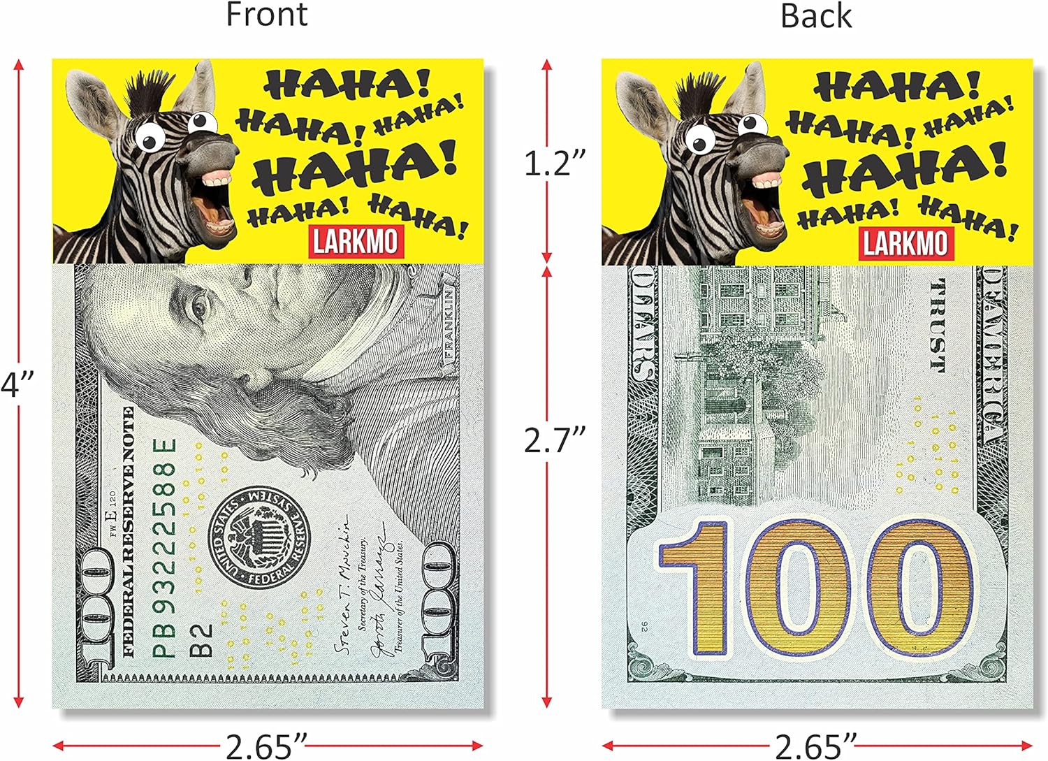 Larkmo The Pranking Zebra Funny $100 Gag, Realistic One Hundred Dollar Bill Joke Office Prank for Men, Women & Children, Great Practical Joke, Kit of 50 Pieces
