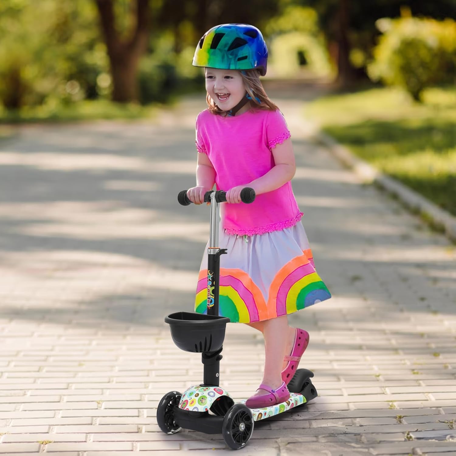 Front Basket – The scooter features a front basket that provides extra storage space and a convenient place for kids to store their favorite toys or snacks during rides.