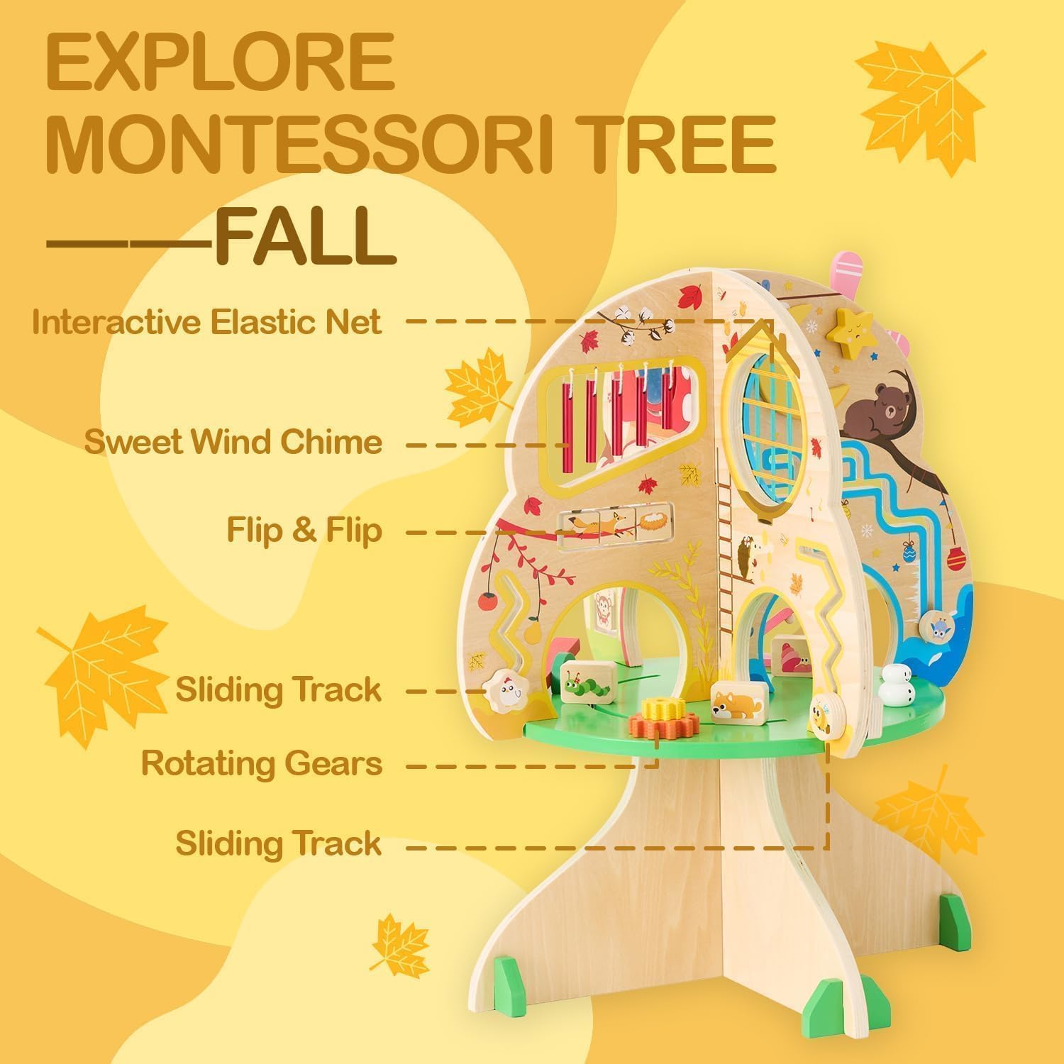 Multi-Fun Activities Board: Discover endless fun with our Multi-Fun Activities Board! From visual exploration with windwill, wind chime, sliding track, mirror, door game, swinging monkey, elastic touching net and elements for music appreciation, our board is designed to captivate young minds and inspire a love for learning.