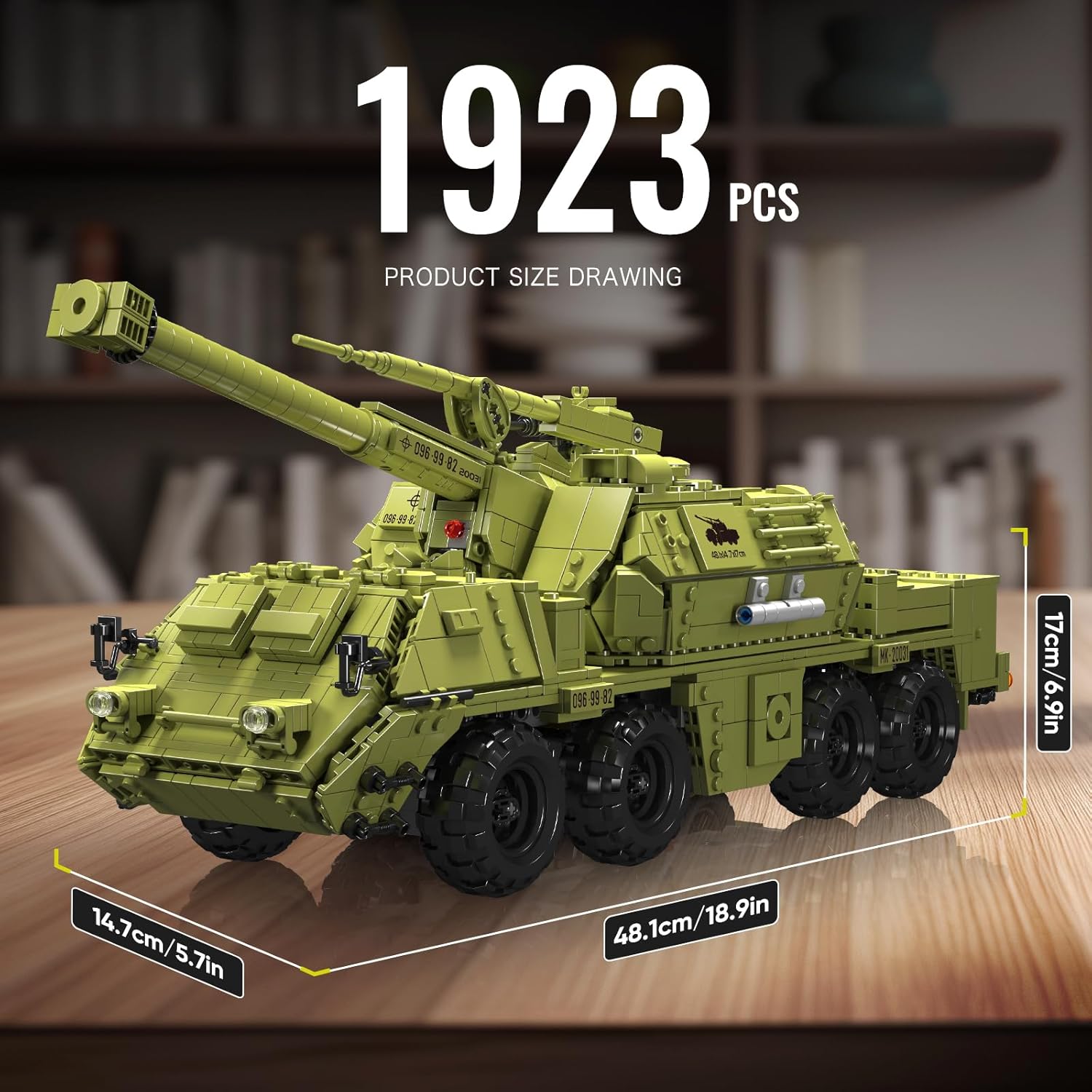 This tank building set has about 1923 pieces parts. All the parts are packaged into a independent packaging numbered bags. Package includes 1*S motor, 1*MK3 power module. The finished size is 18.94*5.79*6.69 inch.