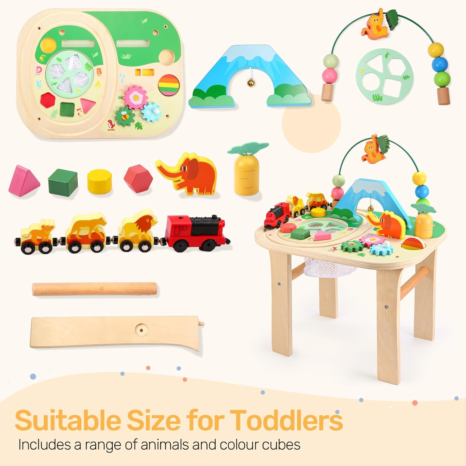 Surprise Gift: Wooden activity table Packed in a delicate gift box, perfect gift for (1~6 years old) boys and girls for Christmas, New Year, Halloween, Thanksgiving; safe and stable to ensure that your child can play for many years
