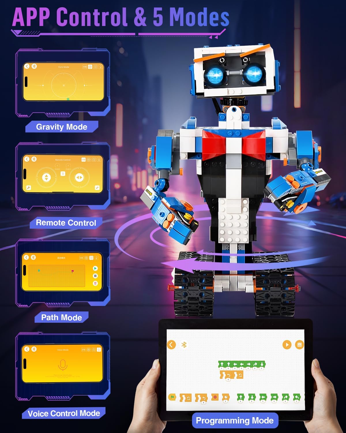 App and Remote Control Robot: Controlling the robot toy through a remote or app is great way to enabling full range movement in all directions, left, right, forward, backward, and even 360-degree rotations. The stem kits offers various interactive modes, remote control, programming, path mode, voice control, and gravity sensor, each adding a new layer of fun, providing multiple ways to play and learn