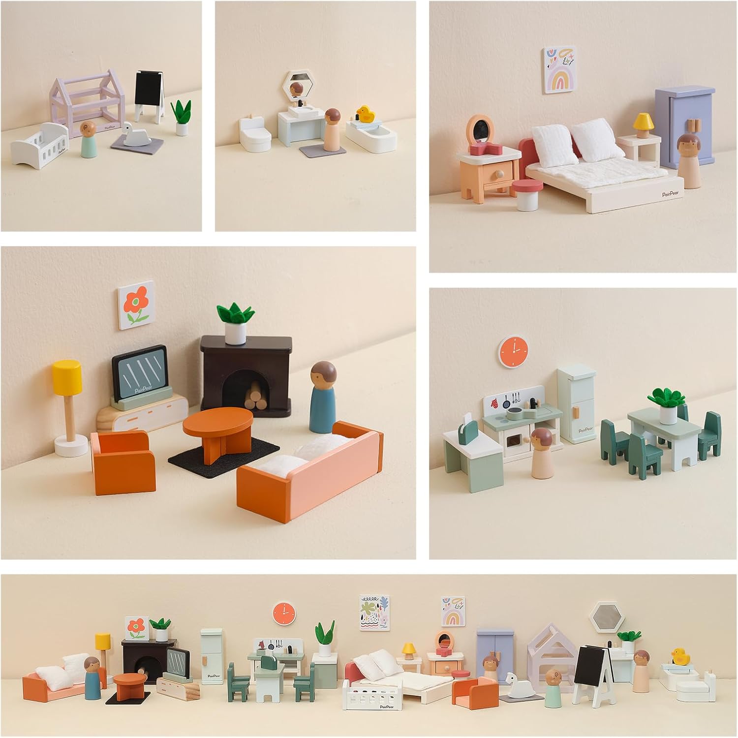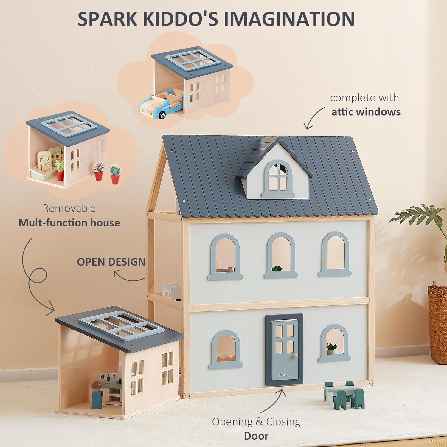 Durable Dollhouse Furnitures: PairPear wooden doll house of each room is colorful, including dollhouse kitchen, living room, master bedroom, bathroom, kidsroom, the mult-fuctional house could craft as a greenhouse, toy garage and more dollhouse rooms. promoting imaginative exploration and design skills