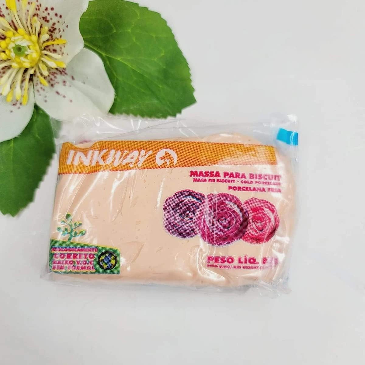 The dough can be colored with fabric dye or mica powder. After opened involve the dough in plastic film removing all the air and guard it in a plastic bag, keep it closed to avoid drying out. Inedible product