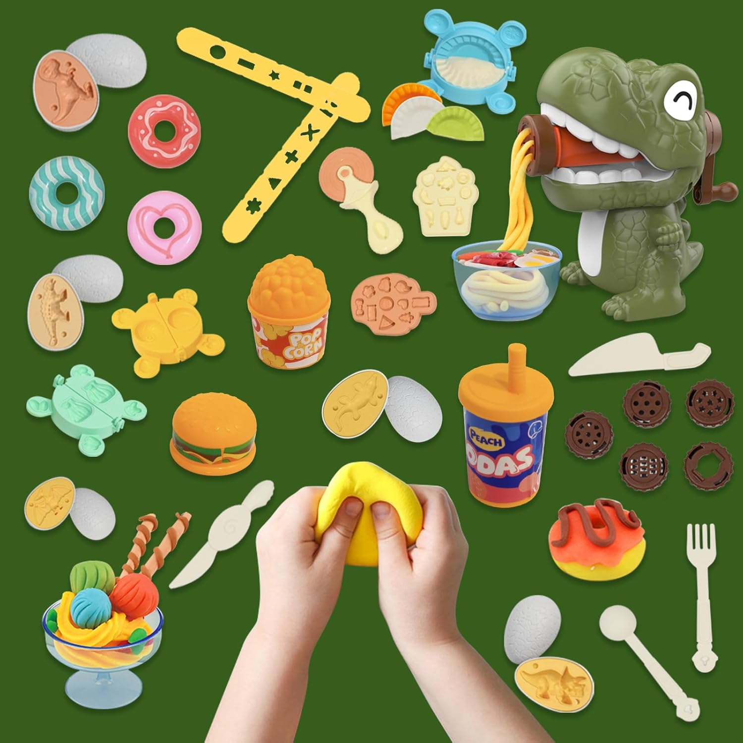 Super Value: Play dough tool set contains 47 dough tools, easy to hold design handle set includes: Dinosaur noodle machine *1, knife, fork and spoon *4, noodle outlet shape mold *4, mold strip *2, dumpling/bun/siu mai mold*3, cup/bowl*2, impression plate *2,French Fries*1, Donuts*3, Corn*1, Rolling Wheel*1, Drink*1, Burger*1, Bread*1, Popcorn *1,Ice Cream Impressions*1, Ice Cream Impressions*1, Dinosaur Eggs*5. 12 * colored clay. They are bright colors that can help children develop physical and mental abilities for color exploration.