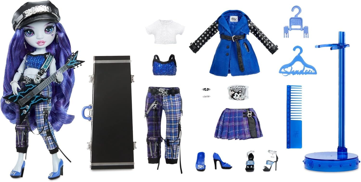 NEON SHADOW ROCKBAND INTRUMENTS: Uma comes with all her essential rockstar play pieces including a black and blue guitar + soft strap, and matching case with stud details. She’s even personalized it with a shadow graphic to pair back to her performance hat. This playset will give kids endless joy and imaginative storytelling entertainment.