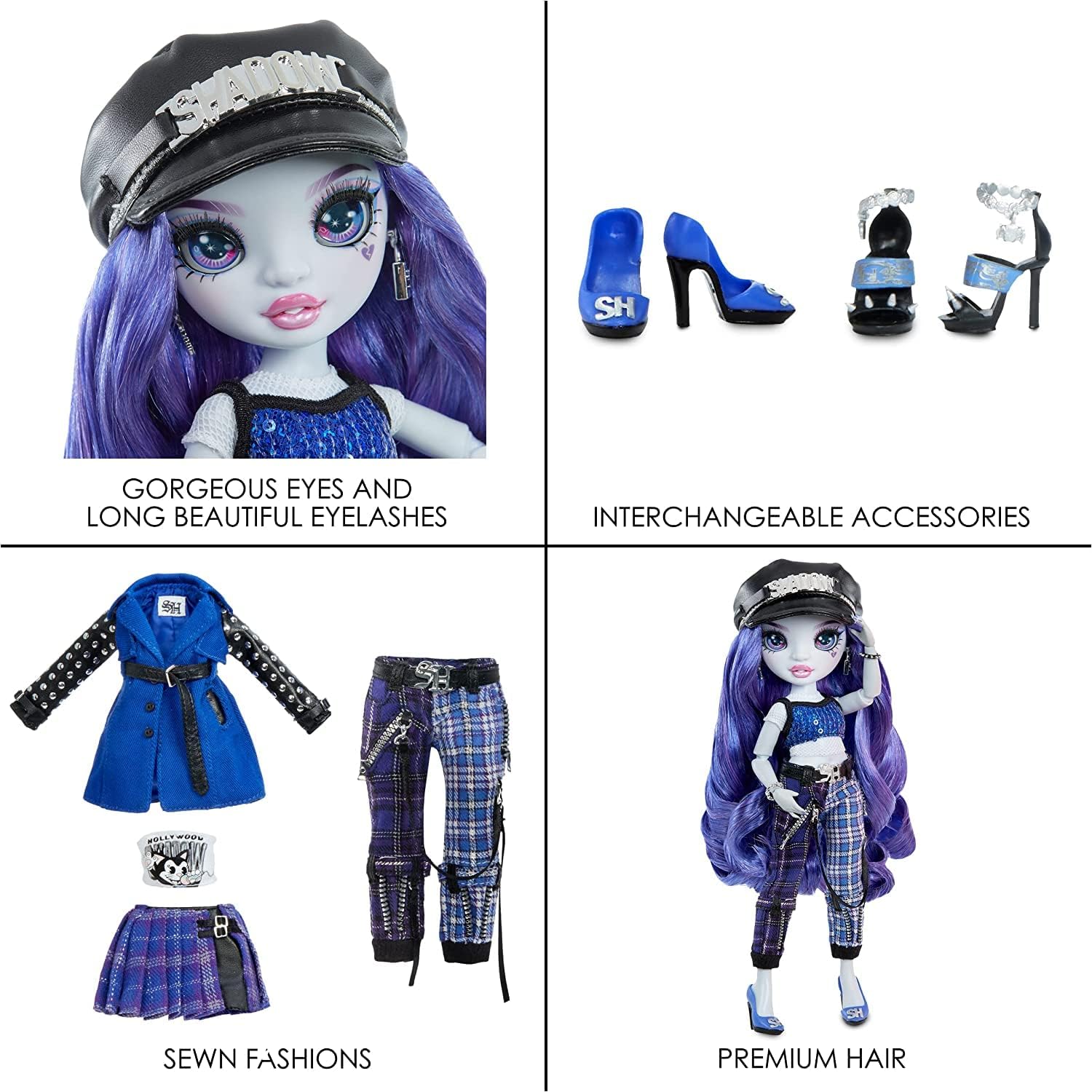 2 MIX & MATCH FASHION: Uma comes dressed in a sequins top over her fishnet shirt, plaid pants with molded buckles and zippers, hat with silver chain and shadow charms, and knee-high shoes with shadow graphic. She also comes with a second complete outfit for mix and match fun. Stud Jacket with belt tie, top with printed graphic, pleated plaid skirt with buckles, stud detail heels, and rocker accessories.
