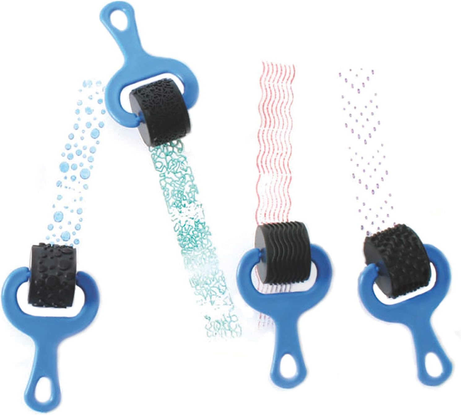 4 DIFFERENT PATTERNS — This set includes 4 heavy duty textured rollers, each with a different raised pattern: 8 wavy lines; small and large circles; squiggles; and 7 lines of dots, dashes and arcs