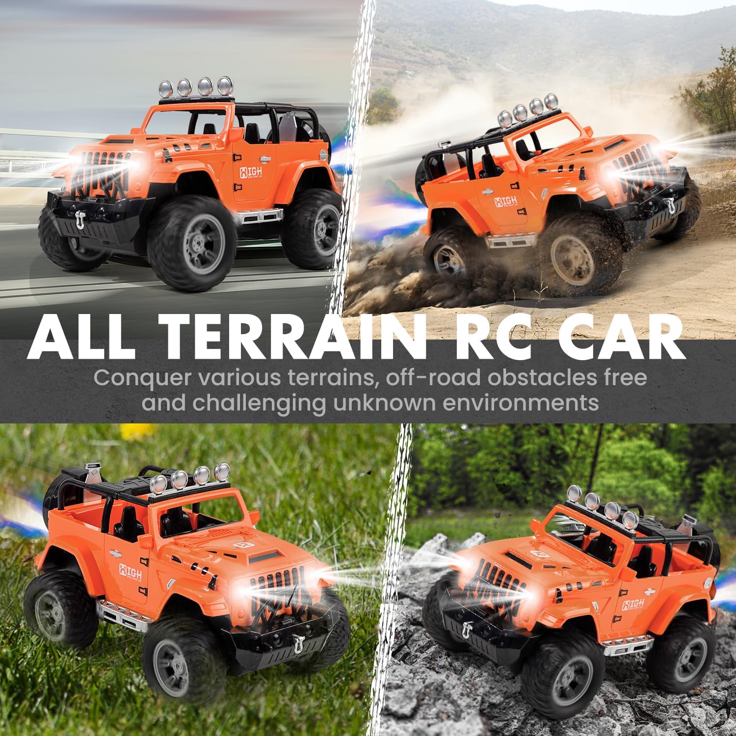 🏕【Applicable to Various Terrains】Well-designed off-road tires with threads that have a strong grip and cushioning to conquer all terrains on the sand, grass, mud, rocky trails, or rough roads. This remote control car offers operations such as forward and backward movement, turning left and right, Jeep RC car with bright headlights/rear lights adds driving fun and ensures safety at night.