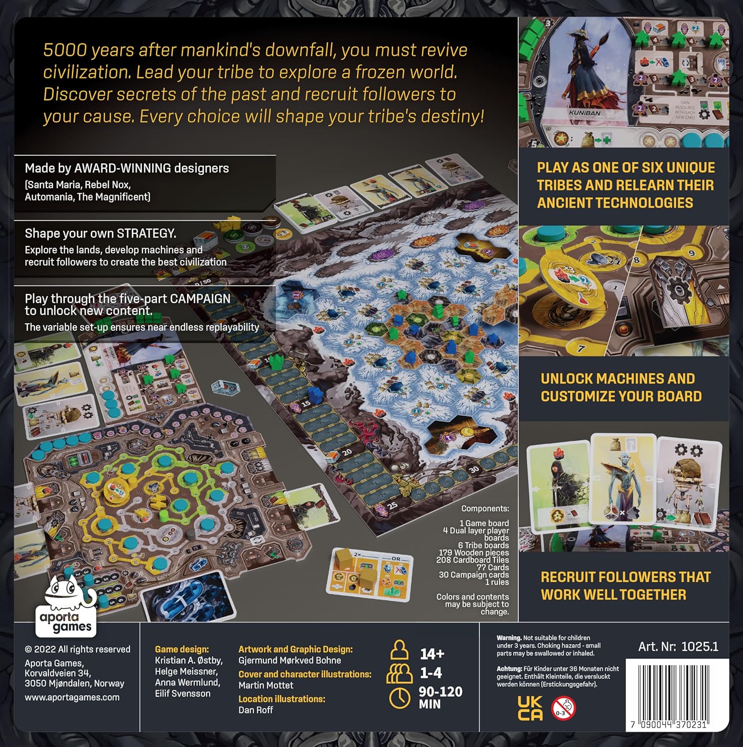 STRATEGY BOARD GAME: Lead your tribe and explore the frozen earth. Harness its resources. Recruit surface survivors to your cause. Build factories with powerful machines. And populate ancient sites to relearn your tribe’s forgotten technologies.