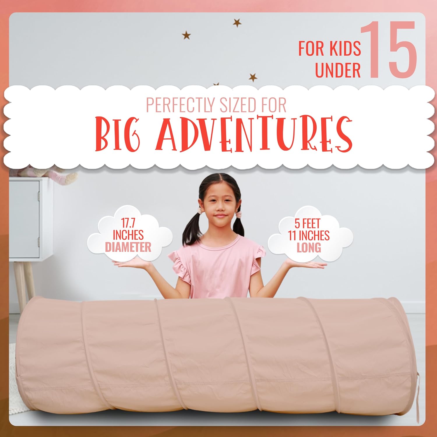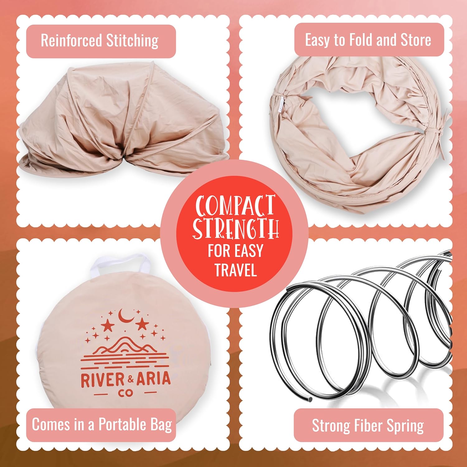 Introducing the River & Aria Play Co Kids Crawling Tunnel, a dynamic, large, folding 6-foot-long polyester peach blend fabric tunnel for kids. Our pop-up play tent is designed to ignite your child’s sense of wonder and adventure. Whether they’re navigating through imaginary landscapes indoors or embarking on outdoor escapades, our versatile play tunnels for babies promises boundless fun and excitement for toddlers crawling babies-6 years old. Constructed with a robust steel spring frame and high-quality polyester fabric, our crawling tunnels for toddlers boasts exceptional durability and safety features, providing parents with peace of mind during their child’s playtime activities. Its lightweight and collapsible design allow for effortless setup and portability, enabling spontaneous play sessions in any location, from the living room to the backyard or beyond. Watch as your child immerses themselves in a world of play possibilities, from classic games like hide-and-seek and scenarios that spark their creativity and social skills. With its spacious interior and engaging design, this tunnel becomes a hub for active play and imaginative exploration, fostering developmental growth and friendship bonds along the way. Surprise and delight your little one with the gift of adventure and laughter while they crawl through our River & Aria Play Co Children’s Play Tunnel. Embark on a journey of endless fun and discovery with your toddler, creating cherished memories that last a lifetime.