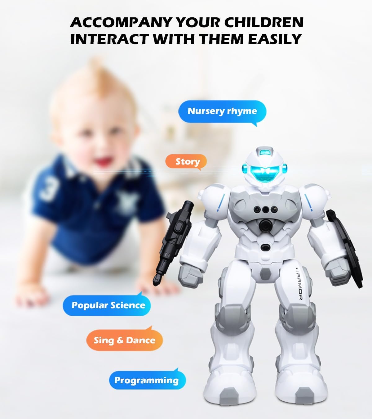 The robot toy will sing songs and dance with its own musics when you turn on the switch. You can also use the remote to control it to tell stories, which is very entertaining. The charming sound effects will give your kids more fun.
