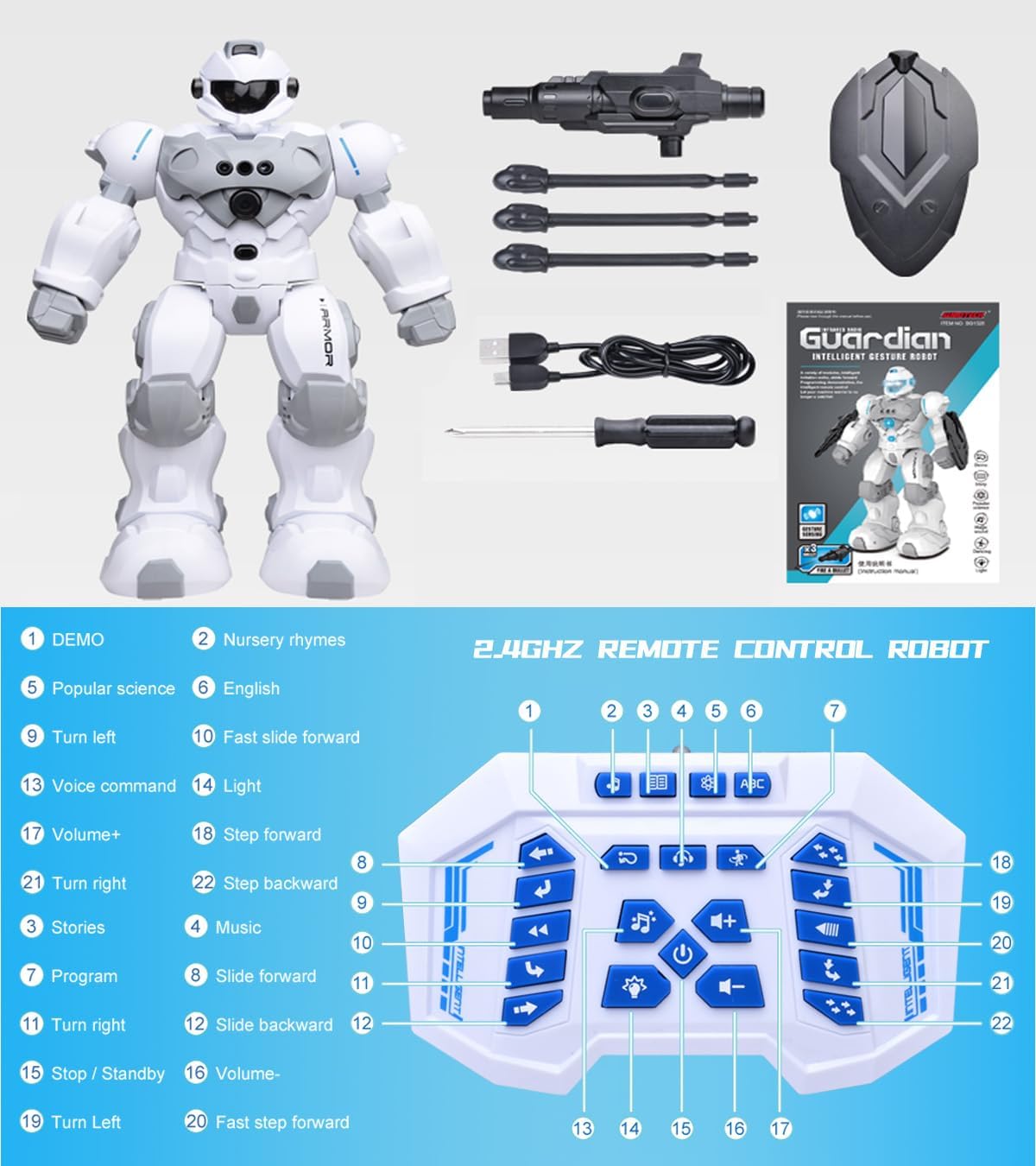 Functions: Programming, Music, Stories, Turn Left/Right, Move Forward/Backward, Slide, Step, Light, Attack.