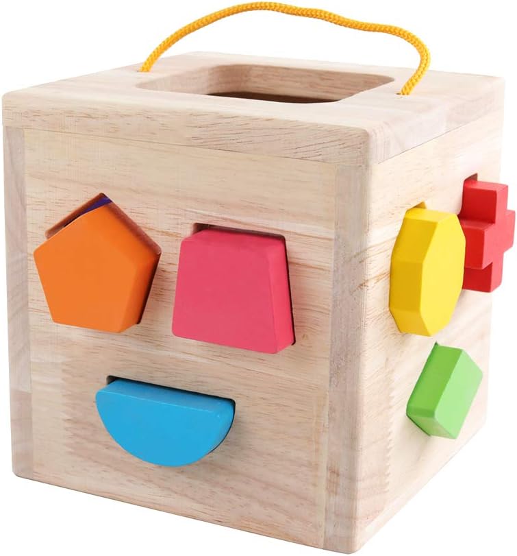SHAPE SORTER CUBE TOY: It comes with 12 shaped multiple color blocks. Bright colors and chunky size make it easy to little hands to grasp. As they drop into the shape sorting cube, fit the pieces in the matching holes. Sturdy construction, premium craftsmanship that can be used for several years