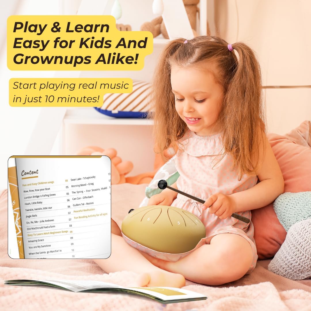 Engaging and catchy children’s songsPopular songs that adults will recognizeTimeless classical masterpieces by renowned composers such as Vivaldi and BeethovenEnjoyable tongue drum activities for family bondingSerene sequences for meditative practicesSpace dedicated for you to express your own musical creations
