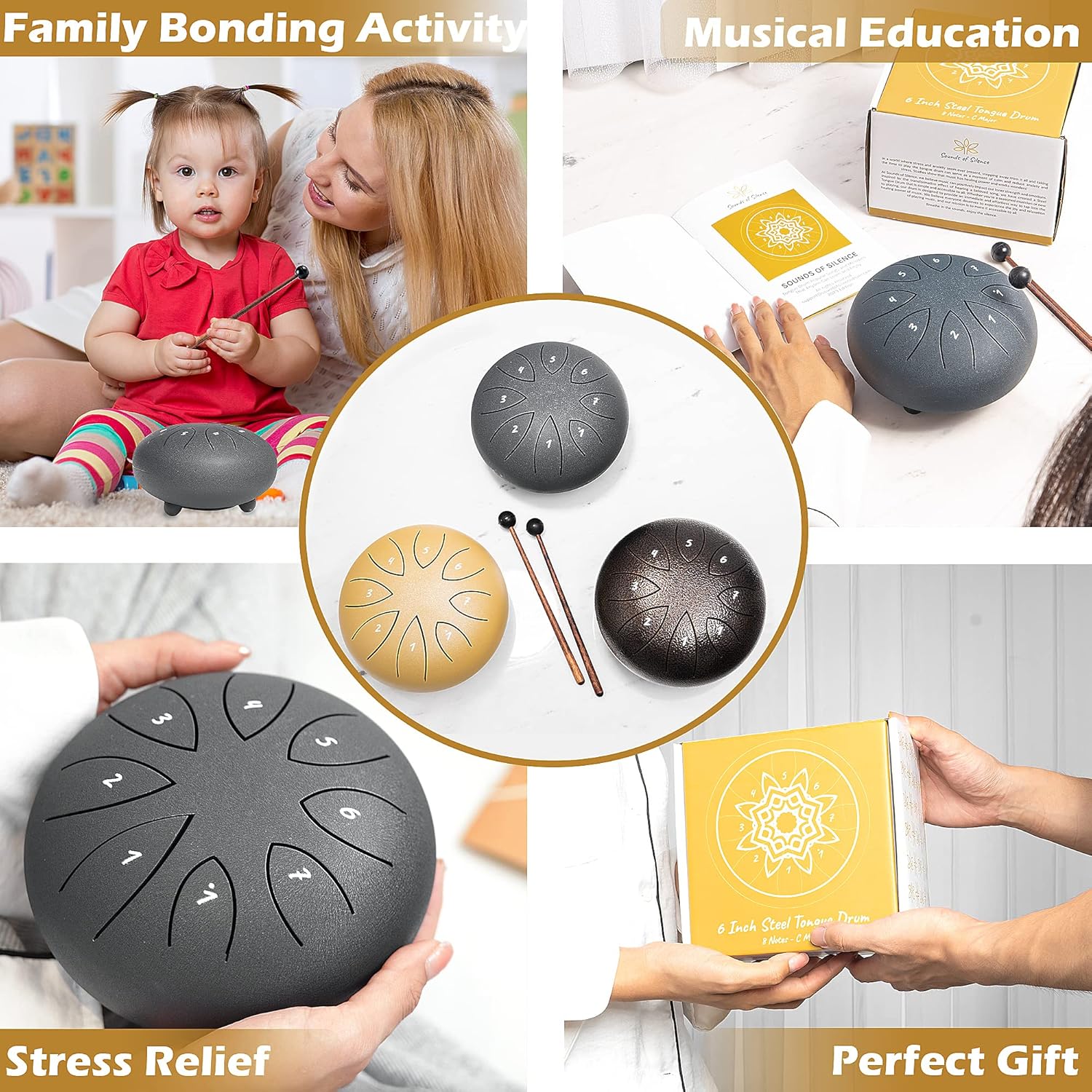 Our Sounds of Silence Steel Tongue Drum is a companion designed to help turn stress into harmonious rhythms. Your journey towards tranquility begins with a single beat.