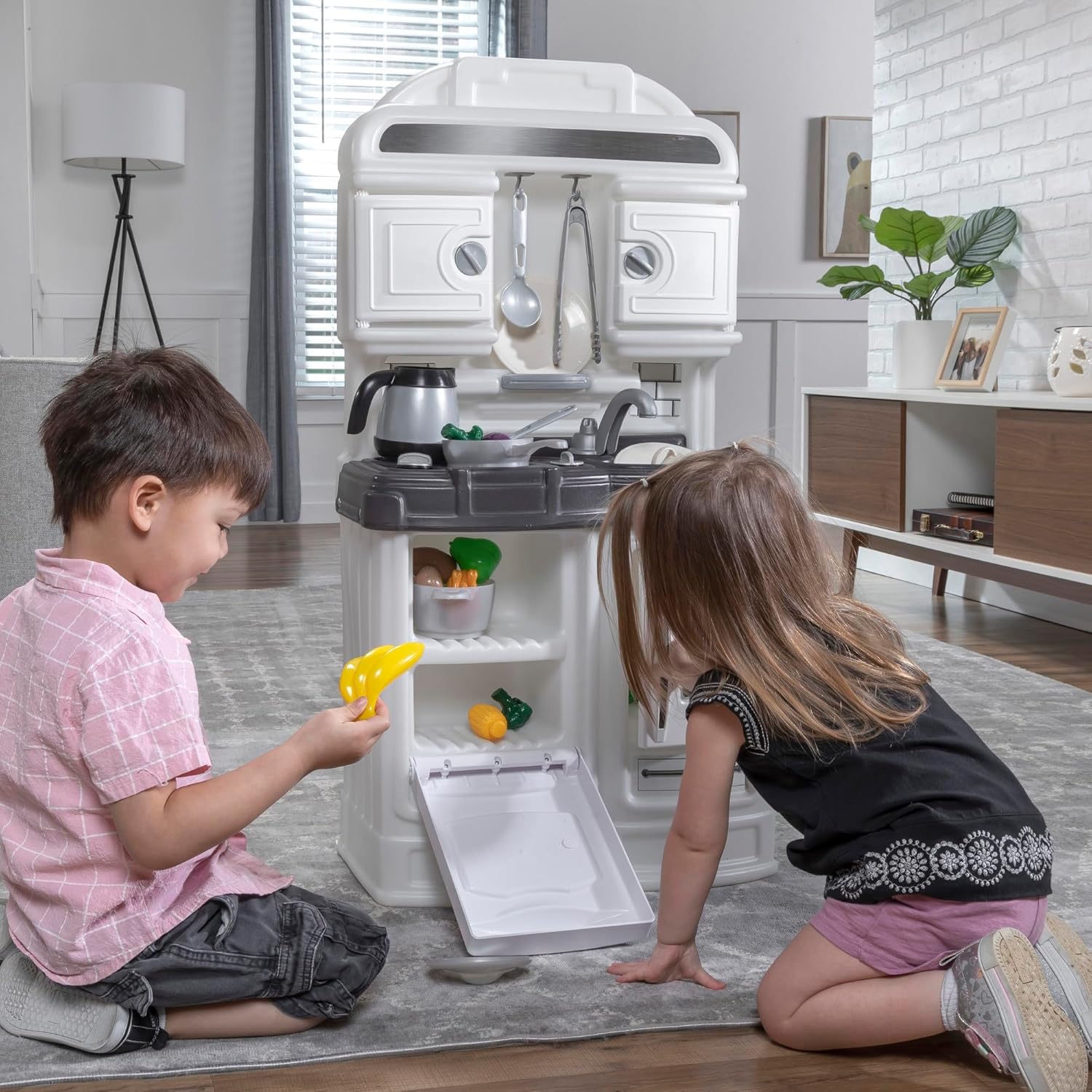 Step2’s Multifunctional Kitchen Playset, a perfect blend of imagination, realism, and durability. This sleekly designed kitchen set offers endless possibilities for exploration and play with its realistic stovetop, sink, oven, and refrigerator, engaging young minds and fueling their creativity. With its neutral coloring, decals, and kitchenware, this compact set effortlessly complements any living space, adding a touch of elegance to your child’s play area. Its thoughtful design ensures that it fits seamlessly into your home, making it an ideal choice for parents seeking both style and functionality. Convenience is at your fingertips with the convenient storage options of our kitchen set. Effortlessly organize and keep everything neatly in place with the spacious cabinets, allowing your child to cultivate good tidying habits from an early age. Take playtime to the next level with our interactive accessories. The 21-piece accessory kit includes pots, pans, silverware, a coffee pot, and more. (Note: Food models are not included in the set.) Adult assembly is required to set up the kitchen set, ensuring a secure and sturdy play environment. Our Toy Kitchen Set is built to withstand years of enthusiastic play. Crafted with durable double-walled plastic construction, it guarantees unmatched durability. The colors are designed to resist chipping, fading, cracking, or peeling, ensuring that the set remains vibrant and captivating for countless play sessions. Choose our Multifunctional Kitchen Playset today and embark on a journey of endless fun, creativity, and lasting memories for your little one.