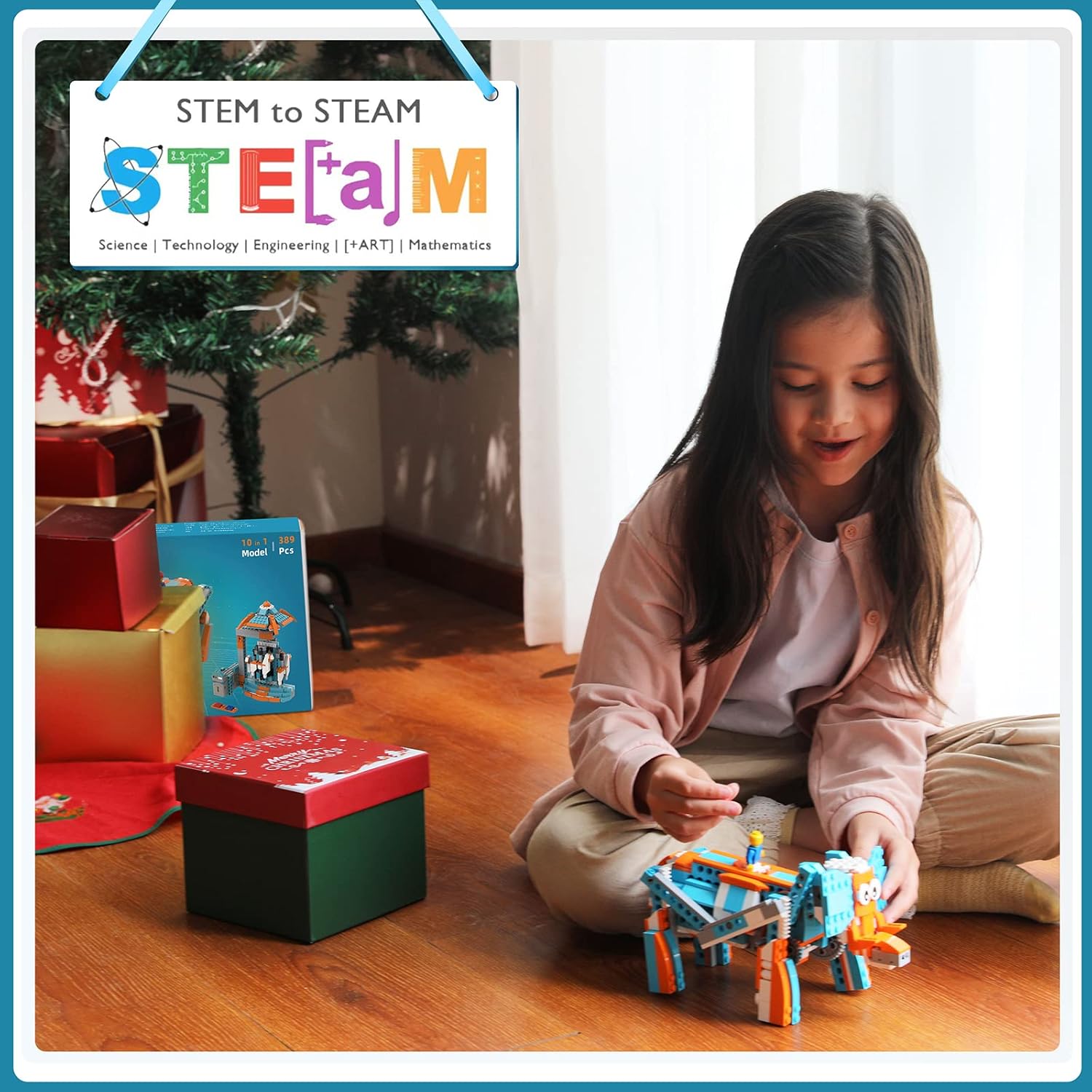 🤖【10-in-1 Robot Kit】Includes 389 building blocks, which children can build into 10 pre-designed robots, including Merry-Go-Round, Music Box, cute Elephant robot etc. Download the APP in your phone or iPad, then via Bluetooth connection. Kids can follow the instruction and video or create their own robots. ROBOT S is one of the best toys and games to teach children AGE 7 and UP with coding, programming and STEM skills in a fun and creative way.(3x AA batteries are required, not included)
