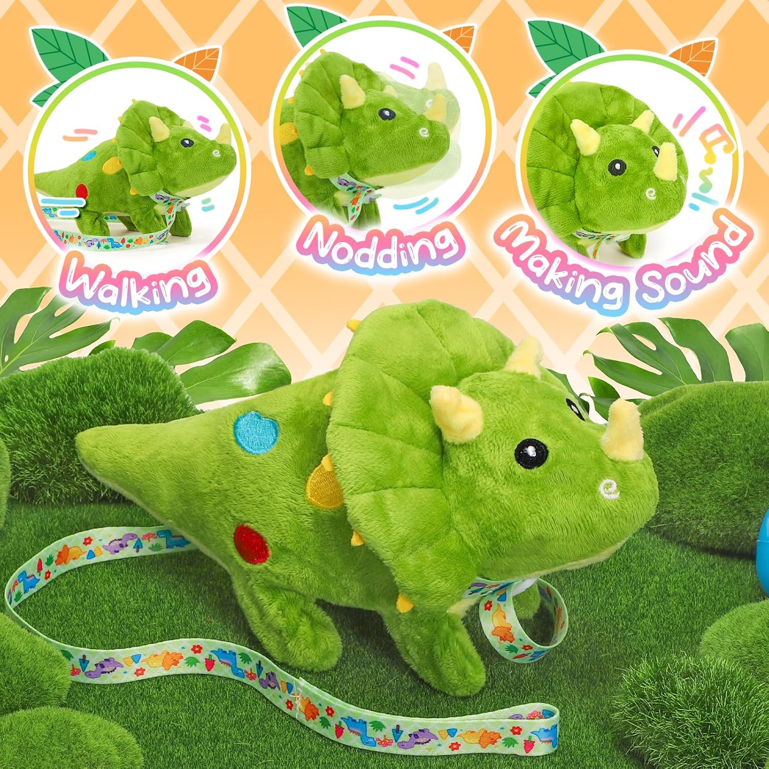 Realistic Design: Our plush dinosaur toy can move like a real one. When you turn on the switch, it will move forward while making sounds and shaking its head and its three horns, which is very cute and attractive.