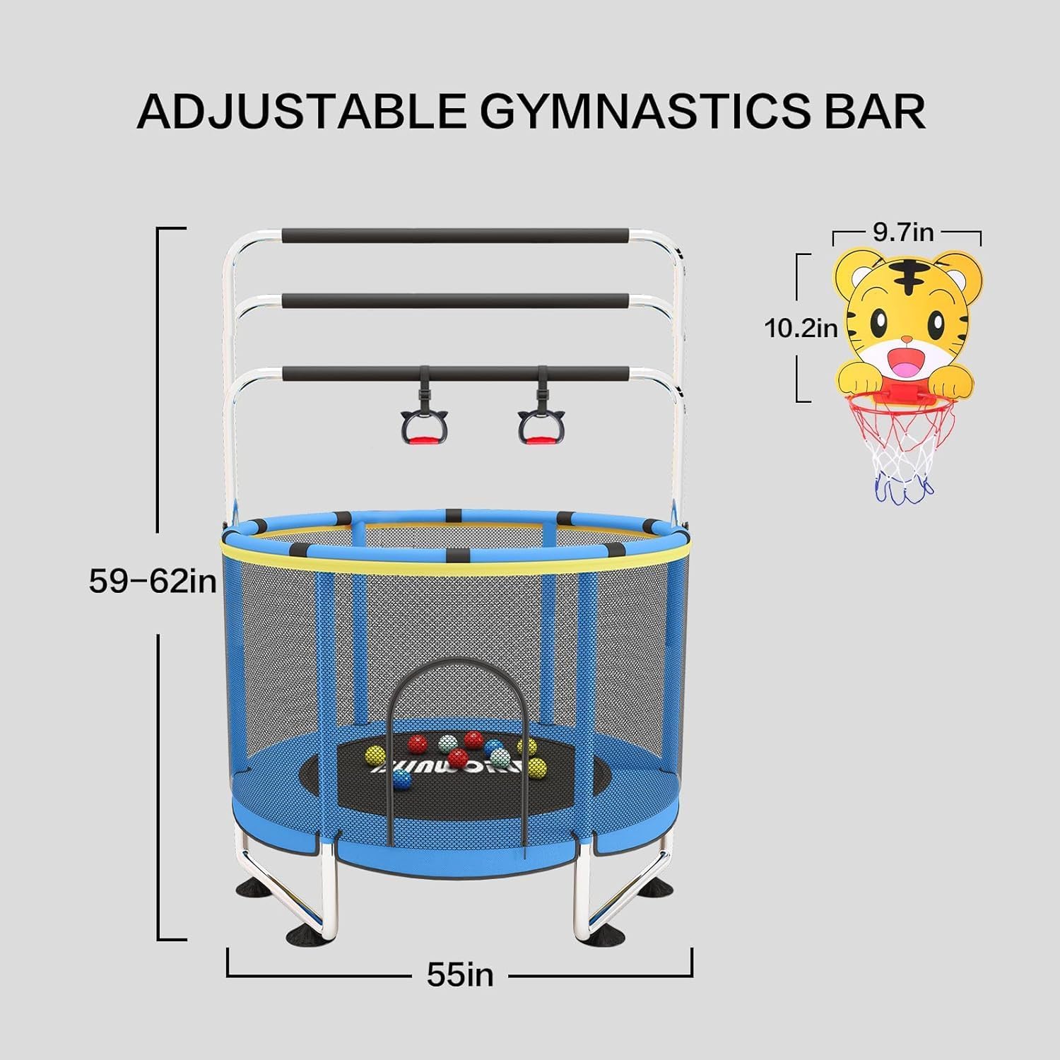 【 3 adjustable height 】 The trampoline includes a 3-level adjustable height of the horizontal bar height design, which can be removed when not needed, and the top is provided with a safety seal for children to play with peace of mind. It can be adjusted from 59 inches to 60 or 62 inches. If your child is addicted to electronics and lacks exercise, you may consider choosing this trampoline