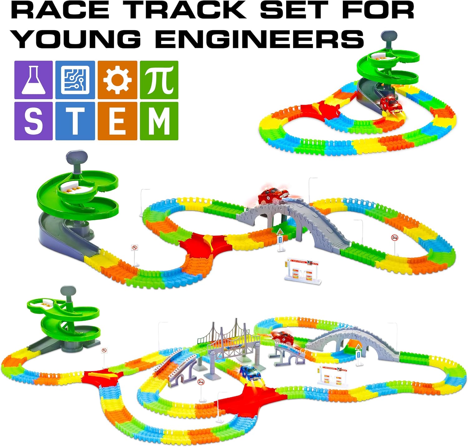 STEM BUILDING RACE CAR TRACKS SET: Create your own race car track designs with this complete buildable race car track set for kids; includes 360 neon car tracks, 2 LED race car toys (batteries not included), 2 bridges, 2 slope frames, 2 lane connectors, and 1 large turnabout ramp