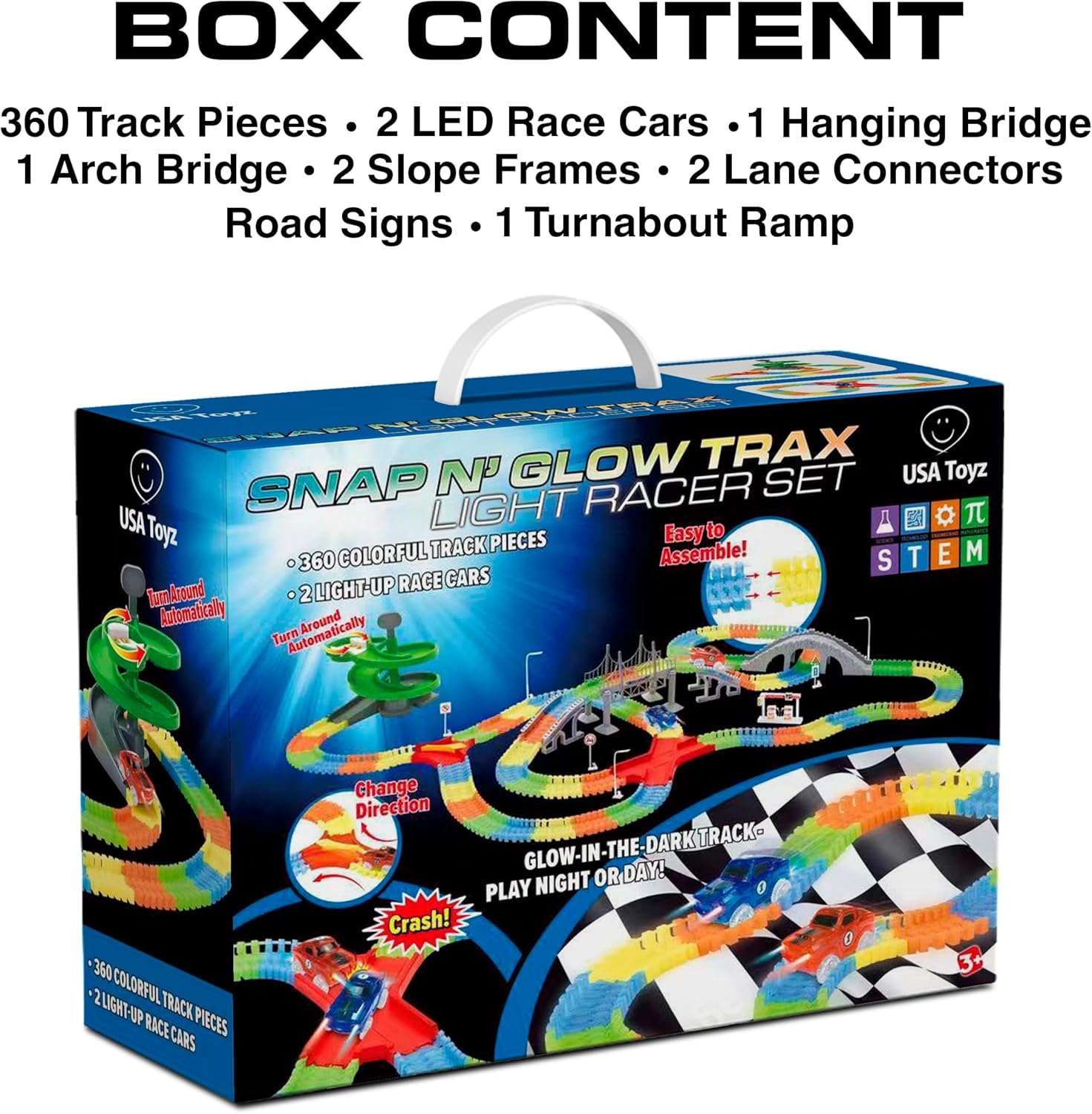 USA Toyz Glow Trax Race Tracks and LED Toy Cars – 360pk Glow in The Dark Flexible Rainbow Race Track Set STEM Building Toys for Boys and Girls with Large Roundabout Ramp and 2 LED Toy Cars