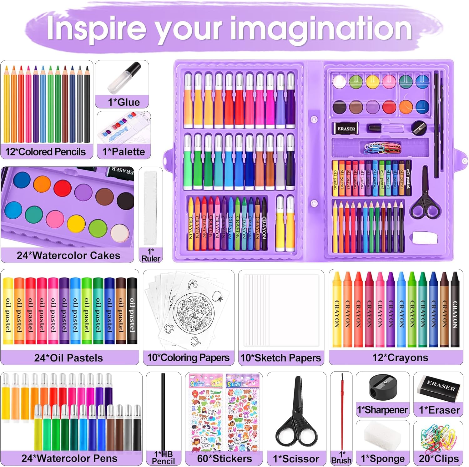 Vigorfun art set has everything your needs to inspire artistic talents, including crayons, colored pencils, oil pastels, watercolor cakes, brushes, sharpener and more… In addition, the art kit also comes with extra 10 coloring papers that have more fun! All neatly organized in a high quality case equipped with sturdy handle.