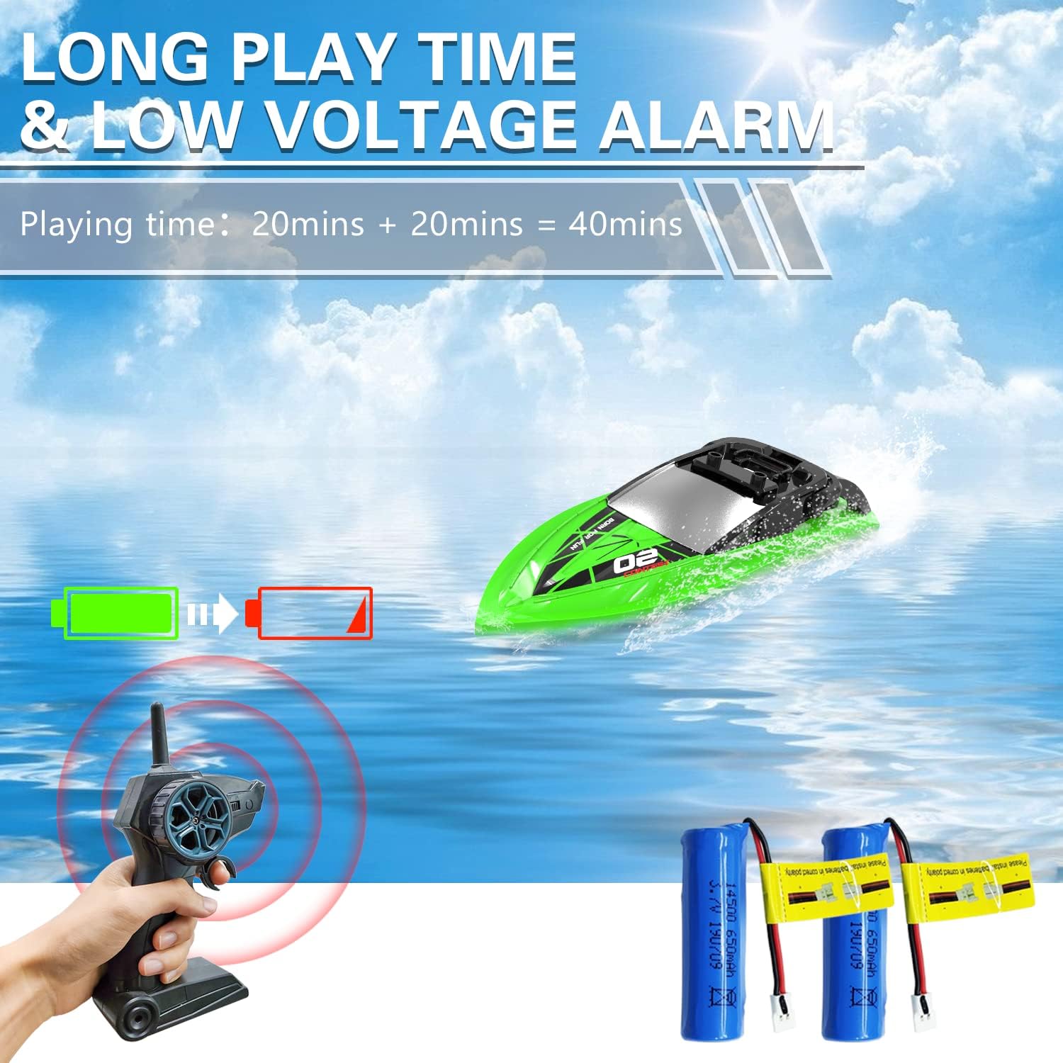 【RECHARGEABLE RC BOAT FOR MORE FUN】Equipped with 2 upgraded 3.7V 650mAh rechargeable high capacity batteries, after fully charged, the remote control boat for kids can be used continuously for up to 20 minutes, the batteries can be repeatedly charged for cycled use. The remote controller requires 4pcs AA batteries (also included). Parents and children control the remote control boat and play happily on the water.